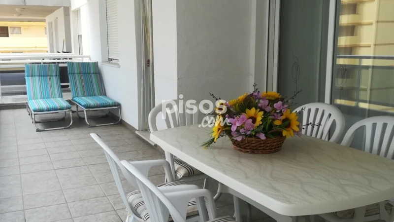 Alquiler larga duracion, en residencial colomeras, a 200metros de la playa morro de gos,y 300metros del pueblo,habitación principal con canapé de 150 y baño dentro tipo suite, otra con 2 camas de 90cm, terraza de 25 metros salida por el salón y por la cocina, Garaje ,piscina ,conserje, tres ascensores,