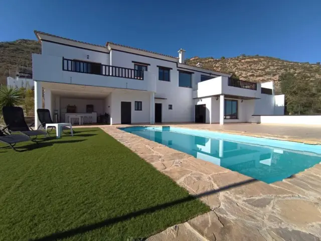 Si estás buscando una vivienda en alquiler, sumérgete en un oasis de tranquilidad en esta impresionante villa de nuevas construcción A ESTRENAR ubicada en el corazón de Antequera. Su diseño elegante y cuidado te invitará a relajarte y disfrutar de cada rincón, así como de sus zonas exteriores que tienen como protagonistas unas bellísimas vistas panorámicas de la imponente localidad y la emblemática Peña de los Enamorados. DISPONIBLE PARA ALQUILER TEMPORAL Y TAMBIÉN PARA SEMANAS O DÍAS SUELTOS (500E/DIA).</br></br>Cuando accedemos a la vivienda, nos recibe un amplio jardín delantero perfectamente integrado con la naturaleza colindante que cuenta con una bonita cascada y pozo, dando acceso a su vez a la entrada principal del chalet, a una preciosa terraza con acceso a la cocina y a la zona de la piscina y bar. En la primera planta encontramos un bonito recibidor que nos presenta un luminoso salón con chimenea y cocina totalmente equipada e independiente con electrodomésticos de primera calidad, que a su vez tiene salida a otra terraza con con vistas en la que desayunar o almorzar totalmente relajado. Dicho recibidor con un armario empotrado perfecto para el almacenaje nos invita a visitar las cinco habitaciones repartidas por esta planta, todas ellas exteriores con vistas a la piscina y al campo, teniendo la principal un baño con hidromasaje y sauna en suite y otra terraza privada en la que ver tan inigualable paisaje desde la cama. </br></br>Pero la joya de la corona de esta impresionante villa es la zona de la piscina con jardín, perfecta para disfrutar de nuestro clima mediterráneo junto a una extensísima zona de recreo, barbacoa y bar, en la que disfrutar de días inolvidables con familia y amigos. La piscina cuenta con baño completo y da acceso a la sala de recreo y juegos en la que descansar tras las comilonas y baños, además de una pequeña pero preciosa bodega decorada con luz indirecta, otra habitación completa y unas escaleras que llevan tanto a la primera planta como al sótano. </br></br>La última planta se trata de un extensísimo sótano y zona exterior empedrada con pista de pádel. Este espacio en bruto nos brinda un sin fin de posibilidades ya sea para destinar a alguna actividad profesional, un gimnasio, más zona de parking o incluso hacer un pequeño aparcamiento ya que tiene salida independiente al exterior. No podemos olvidar destacar el perfecto aislamiento de esta propiedad que destaca frente a las de alrededor y que no solo favorece el ahorro energético si no que protege del frío y el calor a toda la vivienda, ya que la fachada tiene una estructura de 90 + doble placa de Pladur wa de 15mm+ doble placa de lana y fibra y la estructura general de la casa cuenta con forjados de hormigón cubierta por el exterior por doble placa de cemento fibra euronix con doble capa de lana de roca y fibra de vidrio. </br></br>PREGUNTA DISPONIBILIDAD Y CONDICIONES SIN COMPROMISO! Llámanos o escribe al 614393459!</br></br>