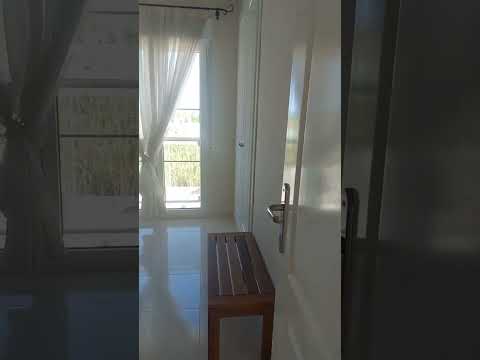 en la planta principal tiene cocina con barra americana, baño con ducha y salon comedor con acceso a terraza de unos 10m2 y con vistas al residencias, piscina y jardines. Arriba tiene 2 dormitorios (uno con vistas al mar y el otro con vistas al residencial y montañas a lo lejos) y un baño con bañera.