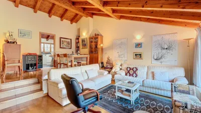 En la planta superior, encontrará una cálida sala comedor equipada con una chimenea, una salida a un balcón con vistas y una excelente exposición al sol durante todo el mediodía. Los techos de madera en el salón, en bajo cubierta, aportan un toque rústico y acogedor al espacio. La cocina, amplia, práctica y funcional, incluye una despensa y tiene acceso a una terraza perfecta para relajarse al aire libre.