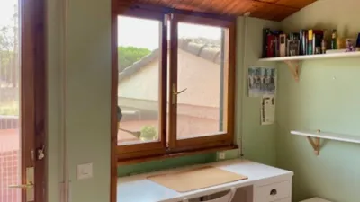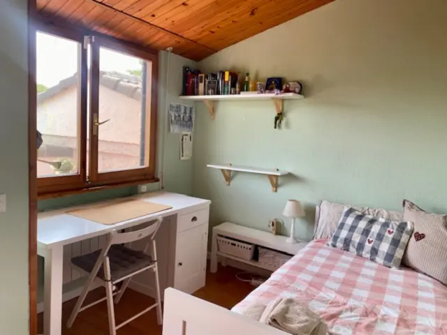 La habitación está completamente amueblada con terraza privada. La casa cuenta con 4.000 metros de finca con barbacoa, mesa ping pong, futbolín, badminton y piscina privada. Además tiene un cobertizo independiente con chimenea.