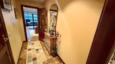 La zona de entrada y los pasillos están decorados con detalles cálidos, suelos de parquet y armarios que aportan orden y funcionalidad.