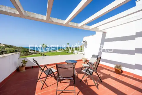 ADOSADO DE TRES PLANTAS CON JARDÍN PRIVADO Y VISTAS AL CAMPO DE GOLF EN NOVO SANCTI PETRI Luminoso y recién reformado adosado situado en una de las urbanizaciones más tranquilas y cuidadas de Novo Sancti Petri, a pocos minutos a pie de la playa de La Barrosa y del centro comercial Novo Center. La vivienda se distribuye en tres plantas: Planta principal: amplio salón comedor con sofás chaise longue abatibles y salida directa al porche y al jardín privado, equipado con zona de comedor, barbacoa, balancín y hamacas. Desde el jardín hay acceso directo a la piscina comunitaria, que cuenta con zona de adultos, zona infantil y pista de pádel. Cocina independiente totalmente equipada (frigorífico doble puerta, horno, lavavajillas, microondas, freidora de aire, menaje completo) y aseo de cortesía. Primera planta: tres dormitorios exteriores. El dormitorio principal dispone de baño privado con ducha, balcón al jardín y una habitación anexa acondicionada como espacio wellness con camilla de masaje y zona de yoga/pilates. Los otros dos dormitorios están amueblados como dormitorio-despacho, con escritorio y sofá cama doble, además de un segundo baño completo. En esta planta también se encuentra un vestidor independiente totalmente equipado. Segunda planta: zona de lavado con lavadora, secadora, tendedero y azotea acondicionada con vistas al campo de golf y a la urbanización. Como elemento singular, la casa incluye un gran estudio artístico o multiusos, ideal para pintura, fotografía o teletrabajo, equipado con caballete y fondos fotográficos. La urbanización dispone de amplias zonas verdes, piscina comunitaria, pista de pádel y dos plazas de aparcamiento (unas aire libre y otra semicubierta). Cuenta con aire acondicionado centralizado, wifi de alta velocidad y todas las estancias son exteriores. Situada a unos 600 metros del acceso a la playa de La Barrosa y a poco más de un kilómetro del Novo Center, con supermercado, farmacia, restaurantes, cafeterías, heladerías y transporte público cercano. Ideal para quienes buscan una estancia de temporada en un entorno luminoso, tranquilo y bien conectado, con espacios amplios para disfrutar, descansar o crear. Precio indicado para temporada escolar completa (de enero a junio y de septiembre a diciembre). Julio y agosto consultar.