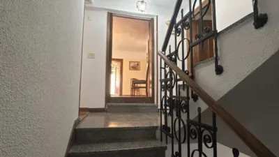Planta baja: Gran portal de entrada con recibidor señorial y escalera con barandilla de hierro forjado.