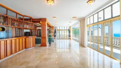 Planta 0, amplio recibidor con un gran salón, con bar y con salida al exterior de la vivienda, con unas vistas impresionantes y con acceso mediante unas escaleras a la zona de piscina (trampolín), cancha de baloncesto y terrazas.