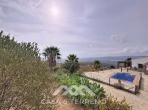 Terreno con 6678 m2 y 336 m2 construidos de casa en 2 plantas, del año 2003. La casa está orientada hacia el sur y tiene unas vistas espectaculares al mar y a las montañas y se encuentra a unos 2 km. de la playa, accesible por carretera asfaltada y el ultimo tramo es de carril. El terreno es rustico de regadío y tiene agua de la comunidad de regante y depósito de agua de medio millón de litros. La casa tiene 5 dormitorios, 1 baño con bañera, 2 con duchas, 2 cocinas (una en cada planta), 2 salones (uno en cada planta), trastero, garaje enorme y terrazas. Piscina en el exterior.