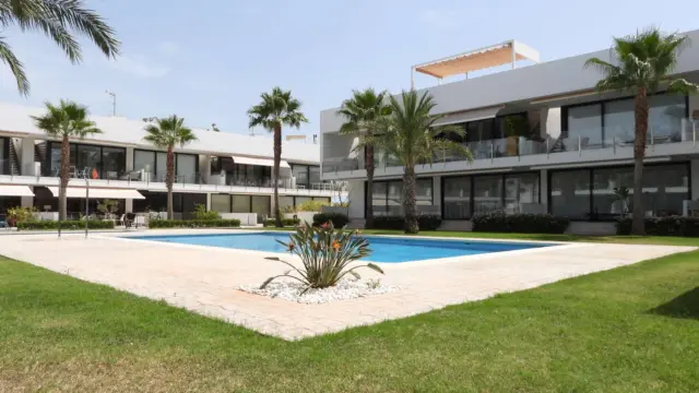 Lujoso apartamento de obra nueva con aire acondicionado centralizado situado en el residencial Antilia Terrace II. Mar de Cristal. Con 2 dormitorios, 2 baños, salón-comedor, cocina americana completamente equipada, gran terraza con vistas a la piscina y jardines, gran solárium de 84 M2 con pérgola, plaza de garaje y trastero. La urbanización, siendo una de las mejores de Mar de Cristal, dispone de una preciosa piscina comunitaria con jardín.