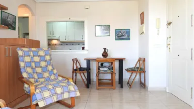 Estupendo apartamento en primera línea del Mar Mediterráneo, situado en Urbanización Las Palmeras (Km 14 La Manga del Mar Menor). Con 1 dormitorio, 1 baño, salón comedor con cocina equipada y terraza con vistas frontales al Mediterráneo.