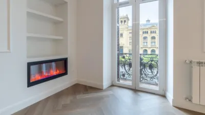 Distribución: se accede al piso por un vestíbulo distribuidor con puertas RF cortafuegos, dando acceso a otro hall, un gran espacio de 47 metros cuadrados donde se ubica una preciosa cocina integrada, amplio comedor con balcón y espectacular salón con un amplio y luminoso mirador ; un dormitorio doble diseñado en formato suite, y equipado con una amplia fila de armarios a modo de vestidor (con mucha capacidad) y con su baño incorporado. Este dormitorio principal también tiene un balcón con preciosas vistas al Teatro Victoria Eugenia.