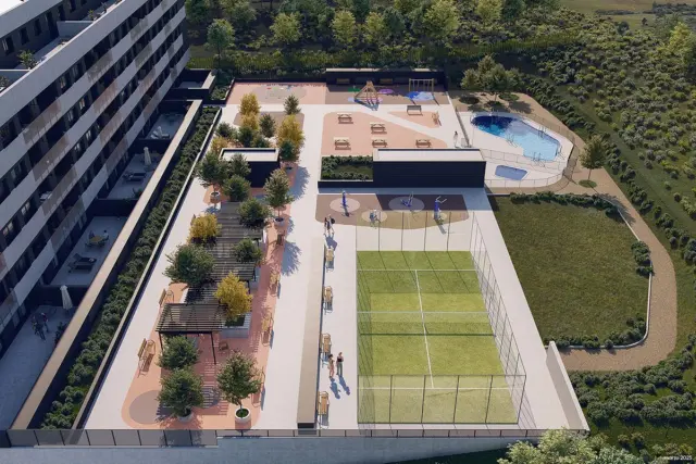 Espacio Natura, un espacio para vivir: una urbanización privada con 2.500 m² de espectaculares zonas comunes diseñadas para ti y tu bienestar. Amplias zonas verdes, piscinas de cloración salina, pista de pádel, gimnasio interior y exterior, áreas de lectura y pícnic… Imagina este gran espacio exterior como una extensión de tu hogar, ideal para relajarte y disfrutar en familia.