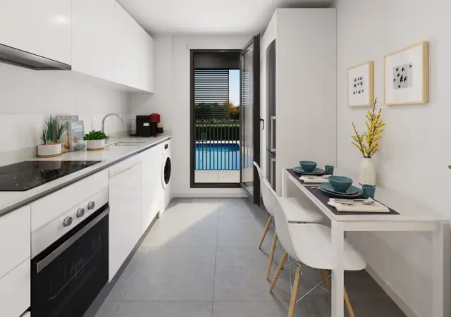 Cada una de nuestras viviendas tiene terraza privada, para que disfrutes de la luz natural y del aire libre. La urbanización cuenta con una amplia piscina común, zonas ajardinadas y servicio de conserjería para tu comodidad, y tampoco tendrás que preocuparte del espacio o del aparcamiento, ya que incluimos garaje y trastero.