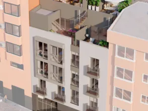 Edificio residencial compuesto por 30 viviendas 2 dormitorios de diferentes formatos y 6 lofts de doble altura situados en planta baja. La mayoría de las viviendas son pasantes para favorecer la ventilación natural. Sus estancias son amplias y tienen una distribución muy funcional donde el salón y cocina tienen conexión a un balcón muy agradable. Así mismo, en la primera planta disponen de 4 viviendas exclusivas con un patio con encanto. Los dormitorios son amplios con una gran superficie de armarios. Se entregan con plaza de garaje y trastero. Su fachada será ventilada al exterior y de tipo de SATE al interior. Lleva instalado suelo radiante y refrescante por sistema centralizado de Aerotermia. La carpintería de aluminio es de rotura de puente térmico con persianas motorizadas de lamas de aluminio en el salón. Las cocinas están completamente amuebladas y equipadas con todos los electrodomésticos.ticos.